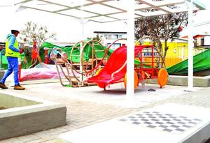 Así se va armando la plaza de los juegos en forma de caracol y las mesas de ajedrez
