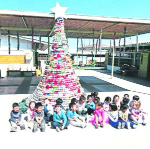 En jardín Capullito arman árbol con latas de bebidas